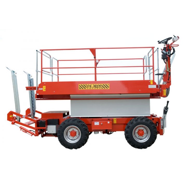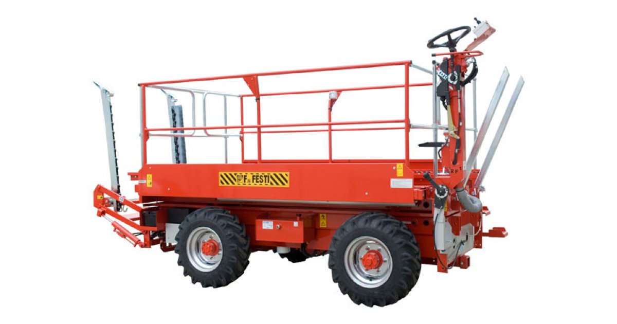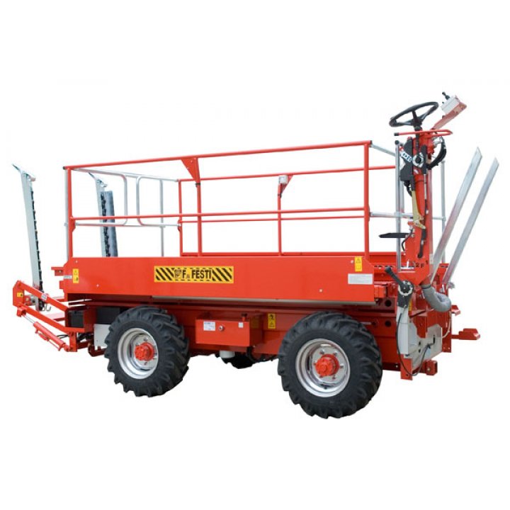 Hidrosztatikus 4 kerékhajtás és 4 kerékkormányzás, hidraulikus fékrendszer a 2 hátsó keréknél, elöl és hátul hidraulikus működtetésű emelőszerkezet görgős ládaemelő villákkal, ládamozgató görgősor a platformon, központi állófék.