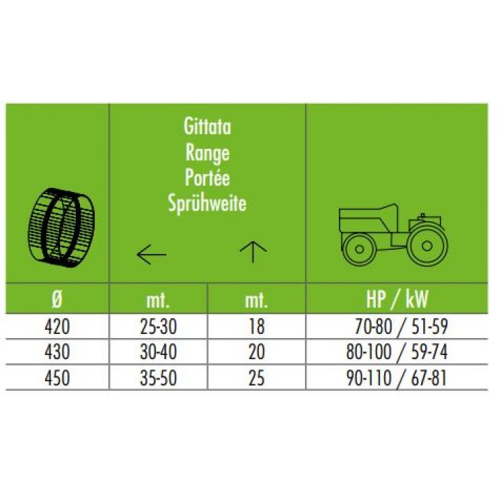 360°-ban forgatható ágyús permetező. Hatótávolsága függőleges irányba max. 18 m, vízszintes irányba max. 30 m.