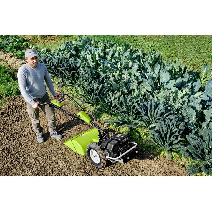 A Grillo G 46 használata rendkívül egyszerű, nem szükséges erővel nyomni a gépet, elég csak finoman irányítani, és a kapálás egyenletes lesz.
